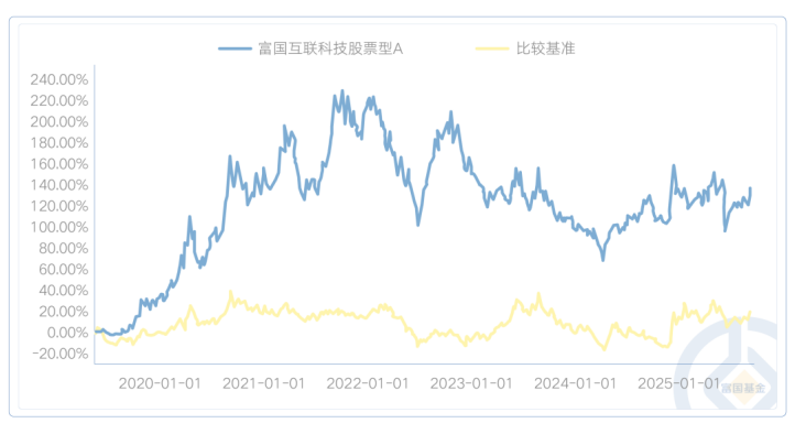 数据来源:基金定期报告,截至2025年6月30日。富国互联科技股票型A成立于2019/03/26,业绩比较基准为中证互联网指数收益率*80%+中证全债指数收益率*20%。近5个完整年度(2020-2024)的基金份额净值增长率(及同期业绩比较基准收益率)为84.98%(14.74%),12.94%(4.48%),-23.14%(-23.67%),-13.13%(5.12%),14.64%(16.15%),数据来自基金定期报告,截至2024/12/31。期间基金经理变动情况:许炎(2019/03/26至今)。基金收益率不代表投资者实际收益率,基金份额净值仅为每份额基金产品的净资产。基金历史业绩不构成对未来业绩的保证。