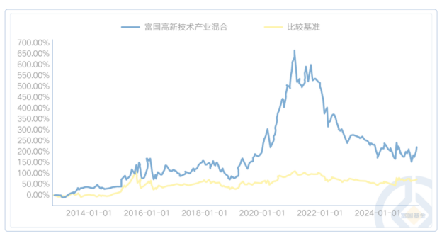 数据来源:业绩走势图,成立以来及业绩比较基准数据来自基金定期报告,截至2025年6月30日。富国高新技术产业混合成立于2012/06/27,业绩比较基准为中证800指数收益率*80%+中债综合指数收益率*20%。近5个完整年度(2020-2024)的基金份额净值增长率(及同期业绩比较基准收益率)为95.53%(21.39%),-0.59%(0.61%),-43.96%(-16.65%),-10.74%(-7.41%),-11.24%(11.72%),数据来自基金定期报告,截至2024/12/31。期间基金经理变动情况:王海军(2012/06/27-2015/11/23)、李元博(2015/11/23至今)。基金收益率不代表投资者实际收益率,基金份额净值仅为每份额基金产品的净资产。基金历史业绩不构成对未来业绩的保证。
