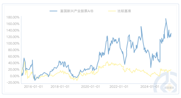 作为一只投资目标定位于新兴产业的产品,富国新兴产业主要专注于寻找长期产业趋势好、市场空间大、景气度向上的细分赛道龙头公司,可以说是一只“弹性高、进攻性强”的产品。从基金业绩走势也可以看到,当科技板块出现机会时,基金业绩有展现较为出色表现的能力。二季报显示,截至2025年6月30日,富国新兴产业A/B自成立以来净值增长率为129.40%,远超同期业绩比较基准19.83%的收益率。