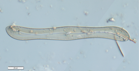 这是一种附着或底栖性硅藻,其结构非常独特,藻体略呈“S”形,壳面中部宽,两端变窄,末端膨大略呈刀状,表面横纵纹交错成网格状,长度可达218微米,主要栖息于河口微咸水生境,对环境变化高度敏感。