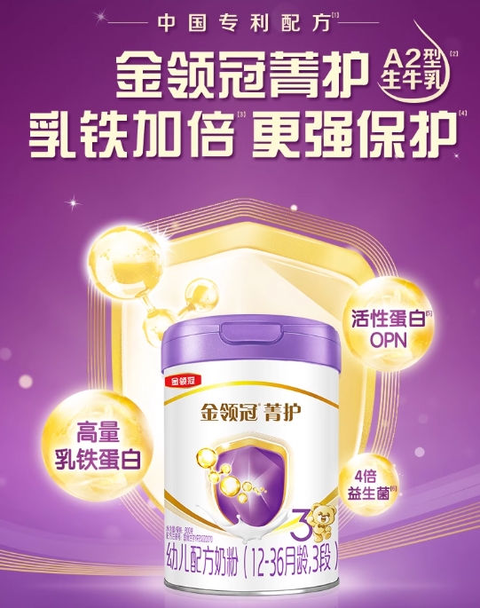 专利蛋白组合:金领冠拥有”α+β”专利蛋白组合,模拟乳源蛋白结构,促进营养吸收,提高免疫力。