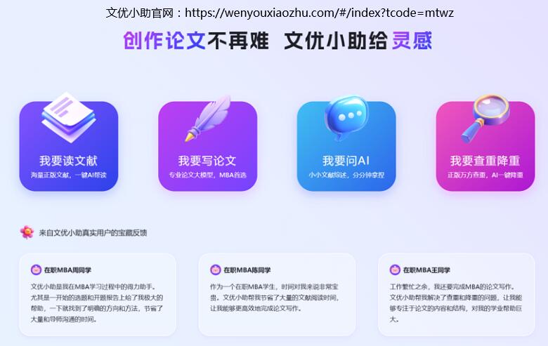 文优小助通过不断拓展和完善其功能体系,涵盖了从论文选题、文献整合、开题报告、查重降重到论文辅导、格式调整、职业发展等多个关键领域,为MBA/EMBA学生提供了一站式论文写作服务,成为他们在学术和职业发展道路上不可或缺的得力助手。
