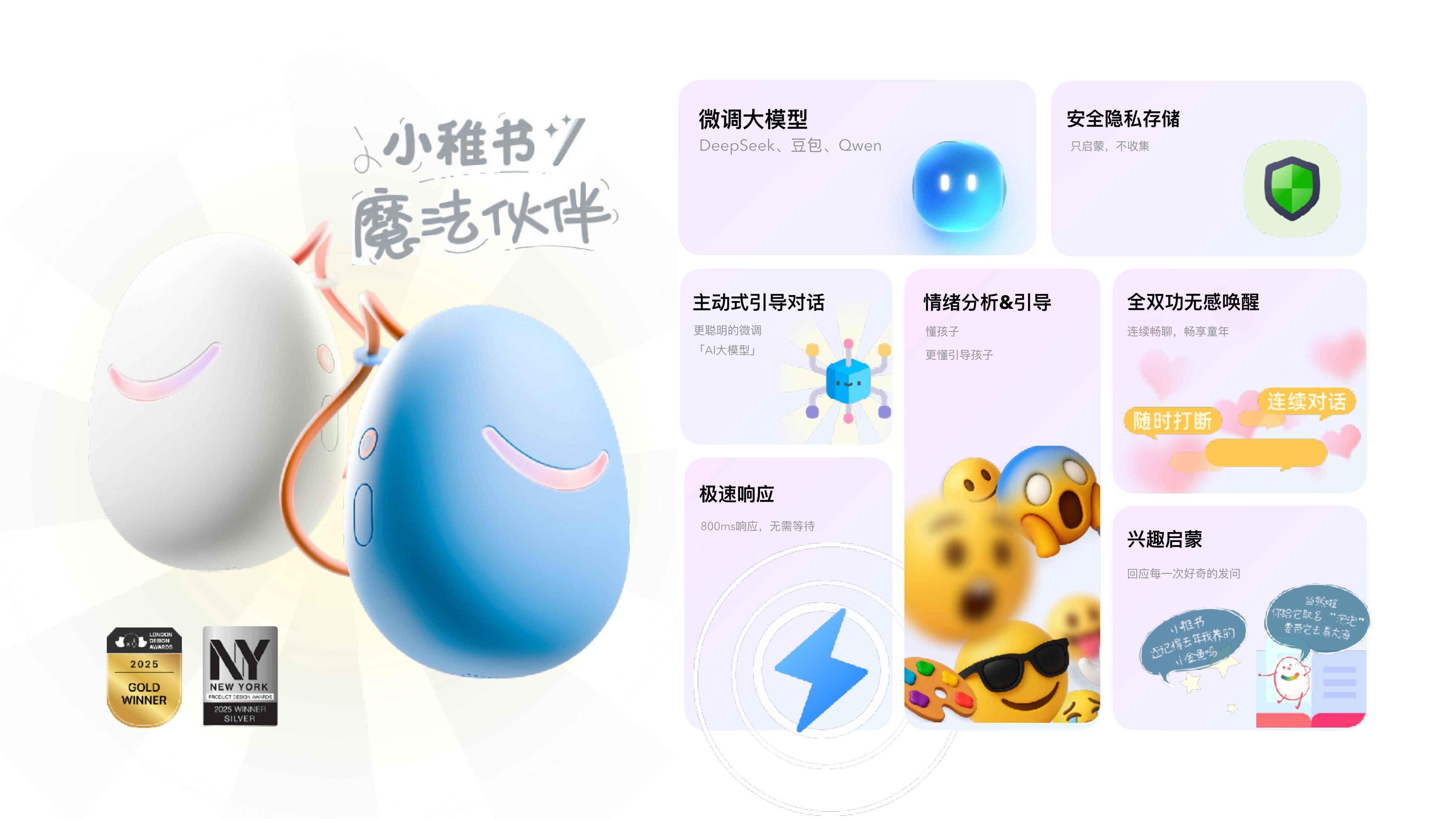 小稚创新(福州)科技有限公司,是一支专注于儿童智能成长的研发团队。核心成员包括拥有千万级流量冷启动经验的 CEO 威宏,以及主导过百万日活系统的技术负责人瑞驰,长期聚焦儿童表达、情绪互动与多轮对话等研究方向,具备软硬件协同能力与大规模系统设计经验。旗下产品小稚书魔法伙伴已通过 CCC、CE、FCC 三重国际认证,并在国际设计类奖项中获得伦敦产品设计金奖、纽约产品设计银奖及 IAI 奖项。