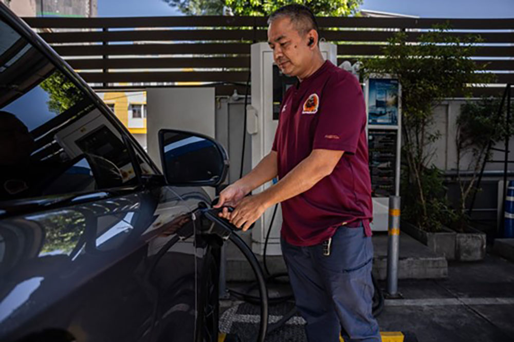 2024年12月1日,泰国曼谷市中心的一家PTT充电站,一名比亚迪(BYD)车主正在为其电动车充电。图片来源:Lauren DeCicca/Getty Images