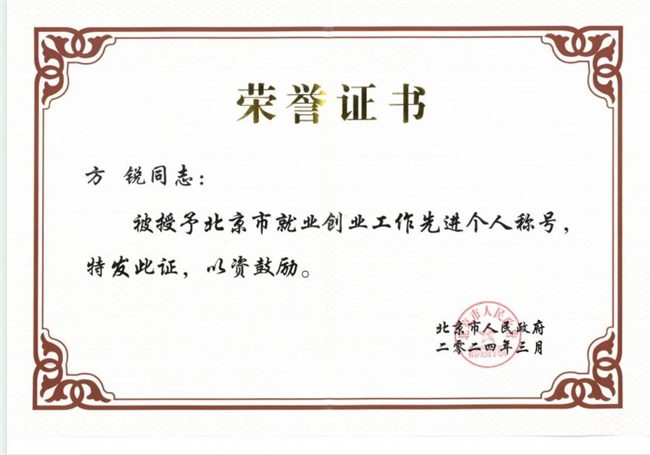 在数年一日的坚持下,其在推动保险科技创新、带动青年就业等方面做出了突出贡献,2024年3月,荣获北京市人民政府颁发的荣誉证书,被授予“北京市就业创业工作先进个人”这一极具分量的称号。这一荣誉不仅是对他个人价值的肯定,更是对其所代表的新型保险服务模式的认可。