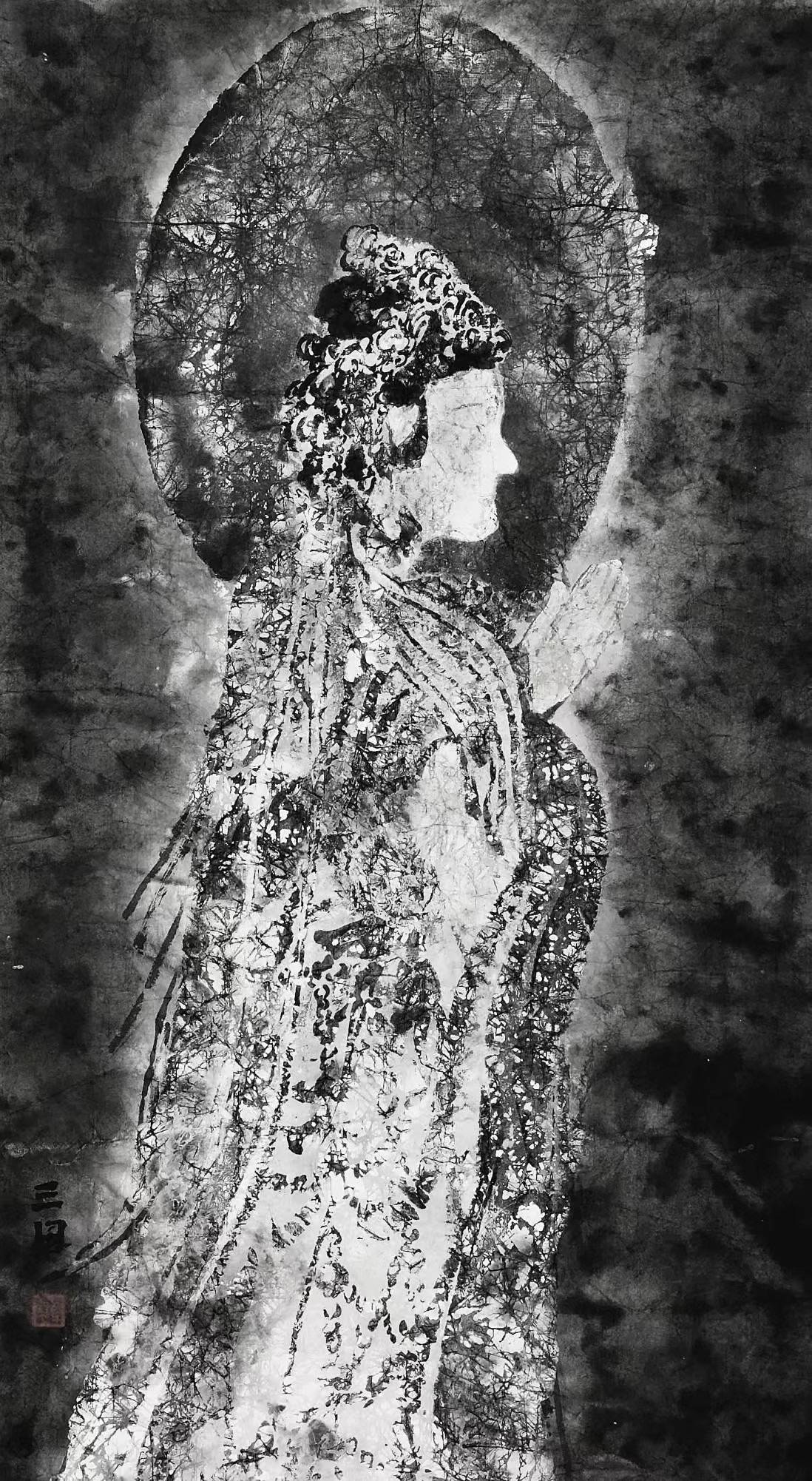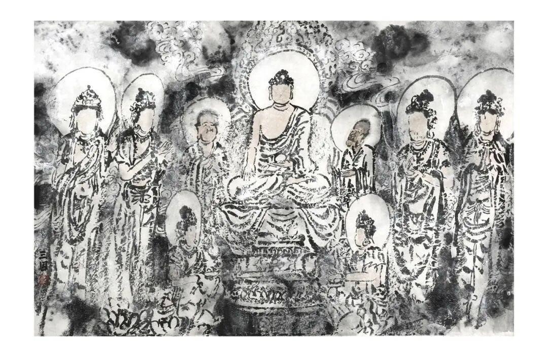张三风的美学在于“动中之寂”,故这些画是他的俨然坐下,亦是他的离枝飞起。画中诸佛、诸菩萨舍离种种分别,运气铿锵、用线酣畅,墨色荡开之处、一片灵光浮溢。