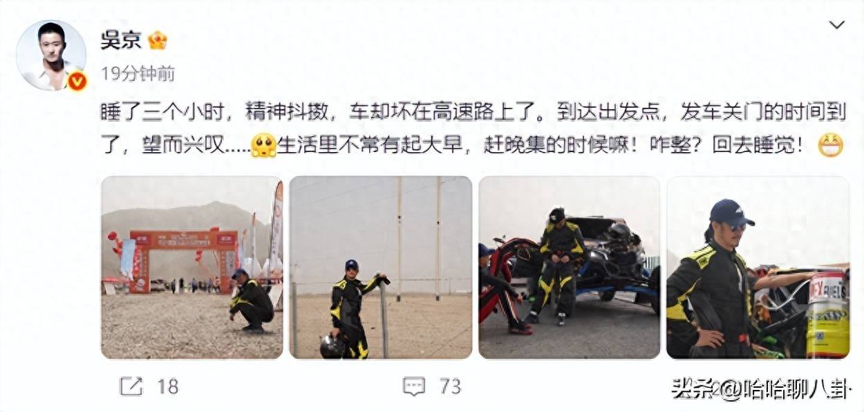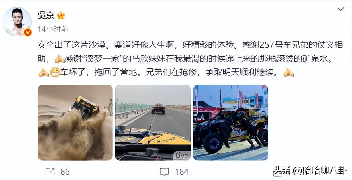 结果刚在5月23日凌晨嘚瑟完“安全出沙漠”,转眼间他的赛车就罢工了,停在了高速公路上。气得吴京凌晨四点就发文调侃“起大早赶晚集”,配图还显得胡子拉碴,看上去就像误入了《荒野求生》的片场一样。