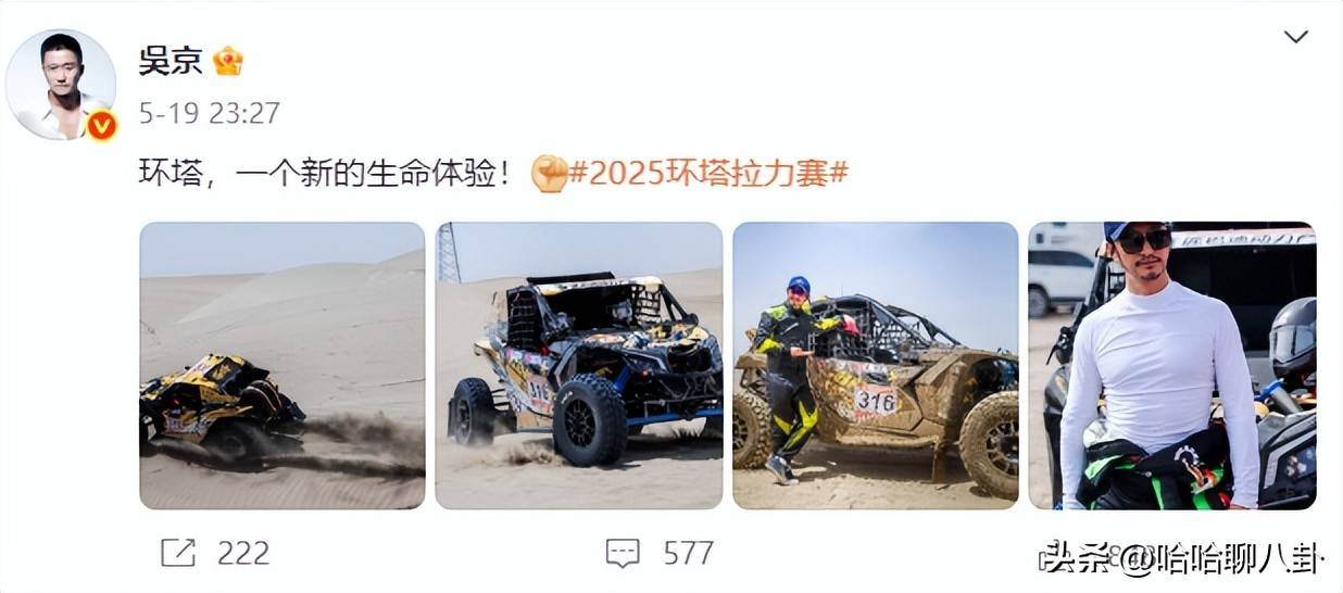 如今,娱乐圈的硬汉们可真是越来越“玩命”,拍戏不满足,竟然都跑去沙漠里挑战自己了!5月23日,51岁的吴京——大家熟知的《战狼》硬汉——在社交平台上一晒自己在环塔拉力赛的“翻车现场”,那情景简直像一头泄了气的钢铁巨兽停在高速路上。想象一下,平时他在电影里开坦克都能漂移,这会儿他居然蹲在路边抓耳挠腮,那个样子,比起在《流浪地球》里操控空间站的紧张劲儿还要让人心疼。